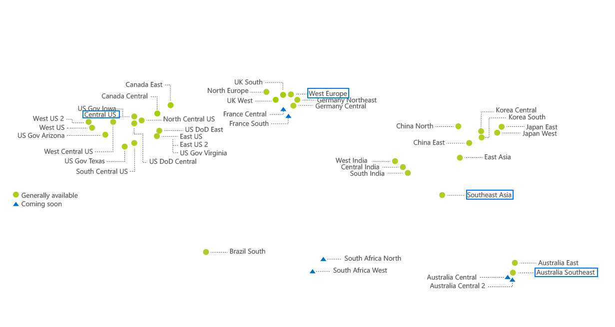 We currently make use of four regions - West Europe, South East Asia, Central US and Australia Southeast.